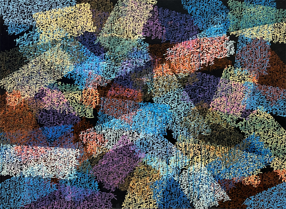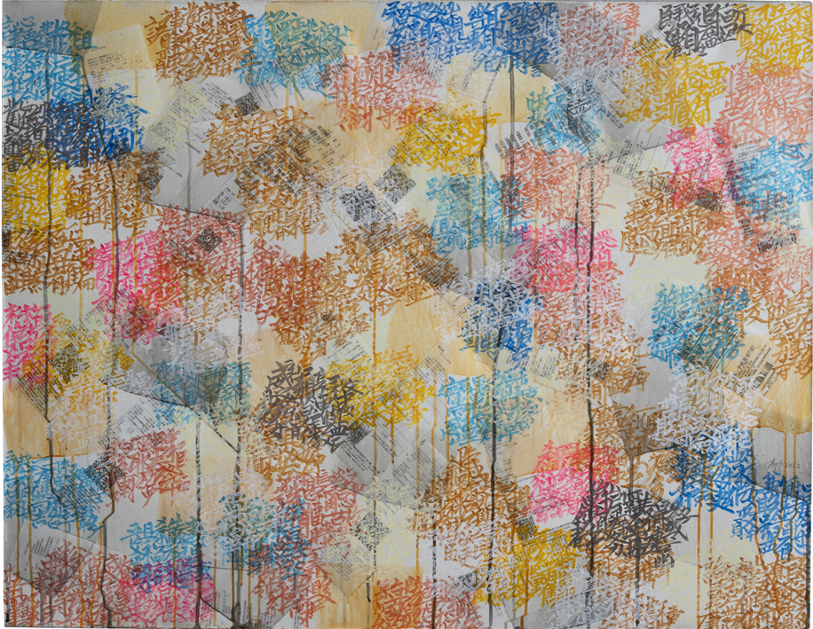 En mi deconstrucción simbólica de los elementos de la caligrafía, la estructura de los caracteres chinos se desmonta, se repite, se superpone y se reorganiza, haciéndose eco del ritmo de la escritura tradicional, ya no sólo en palabras legibles, sino en imágenes abstractas que fusionan la escritura y la pintura. Una metamorfosis que revela la tensión entre la memoria histórica y la realidad de la gente moderna, tratando de trascender las barreras idiomáticas y culturales para transmitir emociones y energía, y que puede remodelar el discurso público del diálogo en el arte contemporáneo. En el entrelazamiento de la escritura y su disolución, la memoria y el olvido, experimento un lenguaje visual único que se extiende a caballo entre la tradición y lo contemporáneo, Oriente y Occidente.